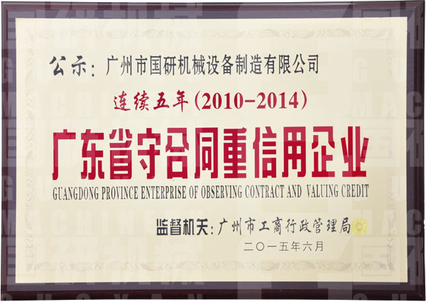 “連續(xù)五年(2010-2014)廣東省守合同重信用企業(yè)”的牌匾在廣州市國研機械設(shè)備制造有限公司的文化展示墻上格外引人注目,這是對公司多年堅持誠信經(jīng)營的充分肯定,也是公司企業(yè)文化“誠信、創(chuàng)新、分享、精進(jìn)”的客觀體現(xiàn)。