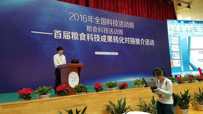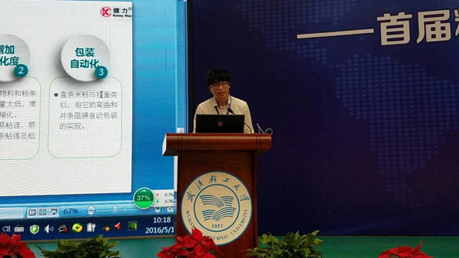 5月17~18日,在武漢輕工大學(xué)舉行的由國家糧食局、中國科協(xié)主辦的2016年全國糧食科技活動(dòng)周上,我司研發(fā)的全自動(dòng)直條米粉生產(chǎn)線被列為全國首屆糧食科技成果轉(zhuǎn)化對(duì)接推介重點(diǎn)項(xiàng)目。公司總經(jīng)理助理王起在推介活動(dòng)會(huì)上作了發(fā)言。